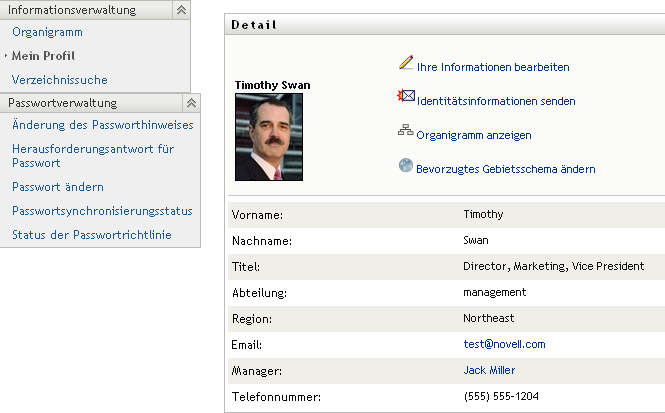 Im folgenden Beispiel wird dargestellt, wie ein Benutzer über Links Detailinformationen zu anderen Benutzern und Gruppen anzeigen kann. Timothy Swan (Vice President Marketing) meldet sich bei der Identity Manager-Benutzeranwendung an und ruft die Seite „Mein Profil“ auf: