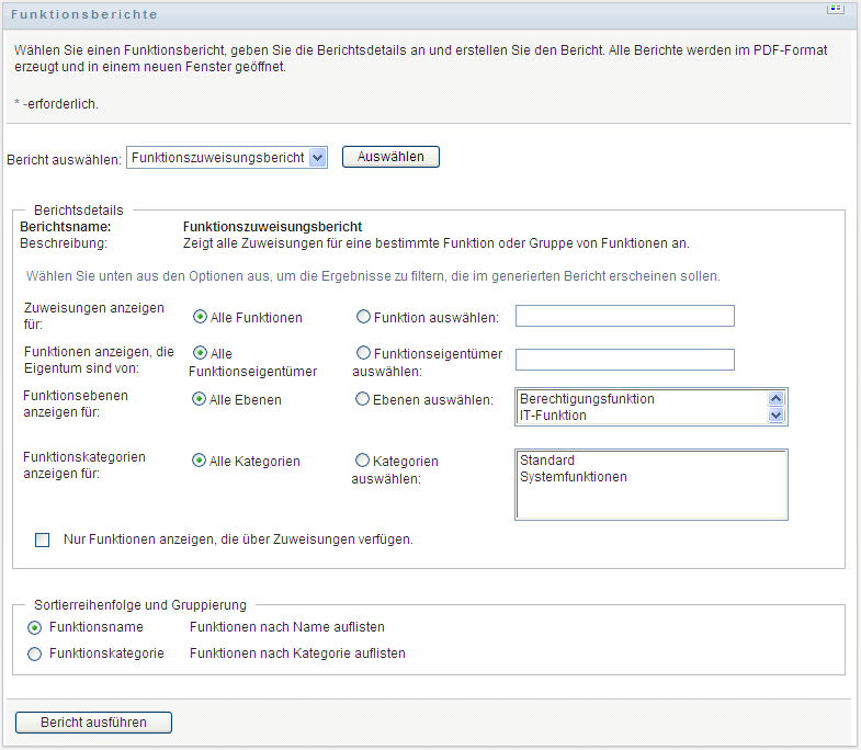 Wenn Sie gewählt haben, Zuweisungen für alle Rollen statt nur für eine Rolle anzuzeigen, wählen Sie unter , Rollen entweder nach Name oder Kategorie zu gruppieren.