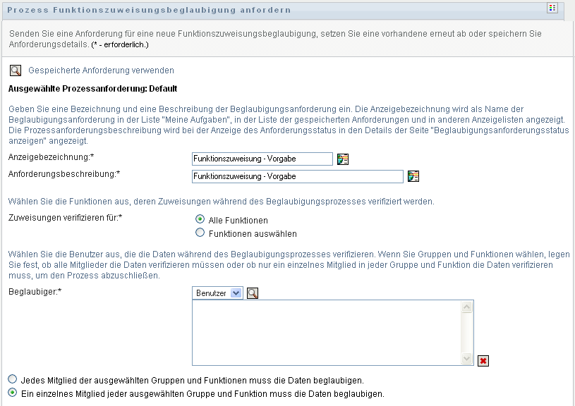 Sie müssen mindestens einen Benutzer, eine Gruppe oder eine Rolle als Beglaubiger auswählen, um einen Beglaubigungsprozess starten zu können. Zum Speichern einer Anforderung ist dies jedoch nicht erforderlich.