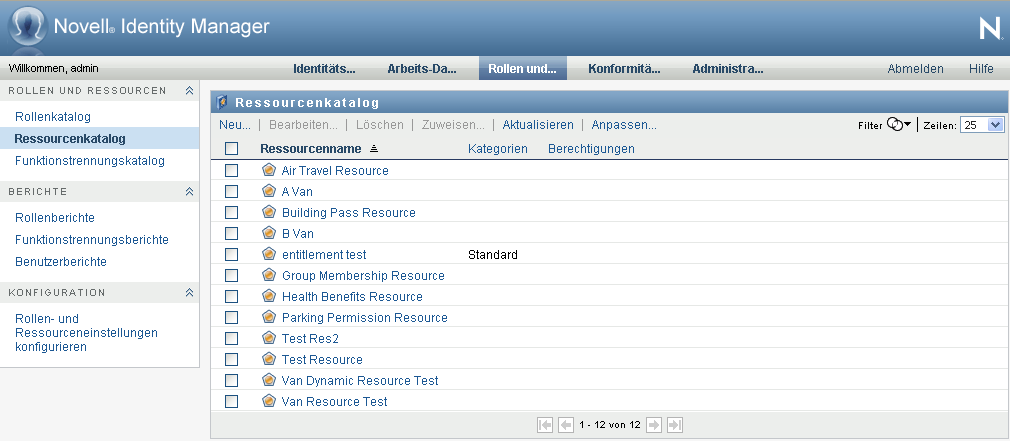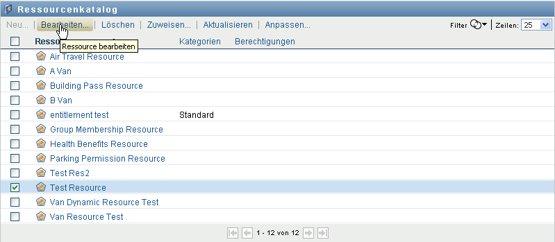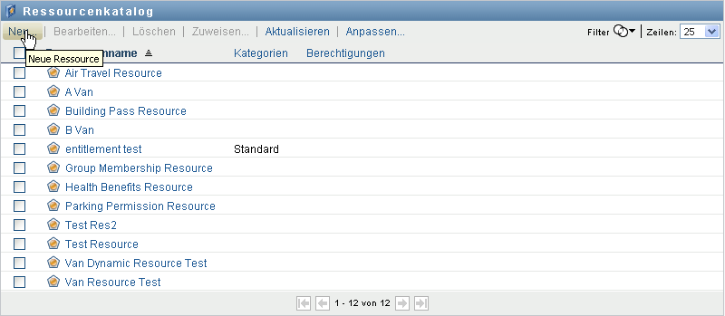 Die Aktion auf der Registerkarte der Identity Manager-Benutzeroberfläche ermöglicht Ihnen das Anzeigen von Ressourcen, die zuvor im Katalog definiert wurden. Darüber hinaus können Sie mit dieser Aktion neue Ressourcen erstellen und vorhandene Ressourcen bearbeiten, löschen und zuweisen.