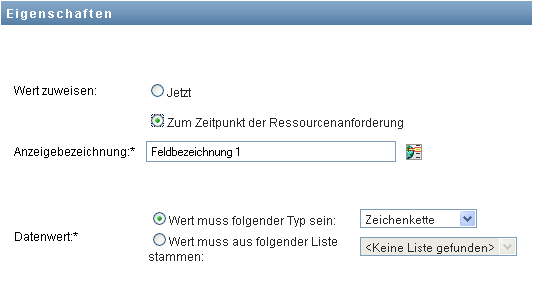 Geben Sie eine Anzeigebezeichnung für das Feld an und legen Sie fest, ob der Wert einen bestimmten Datentyp besitzen muss oder aus einer Liste stammt.
