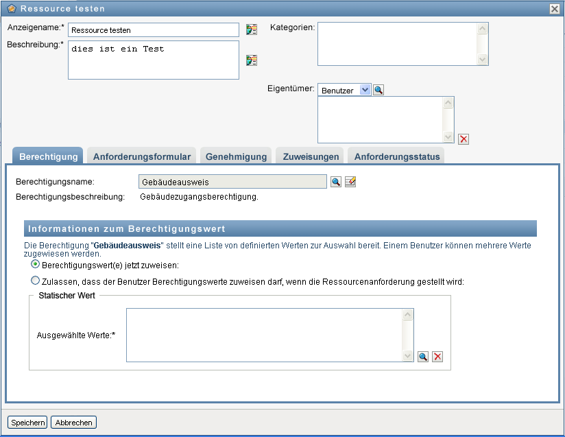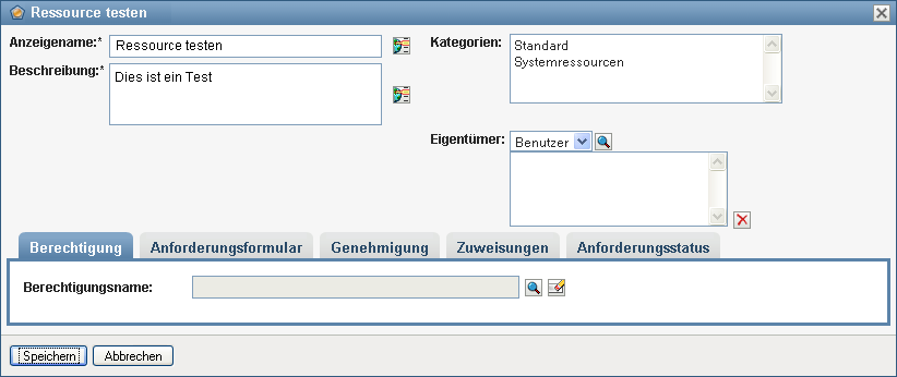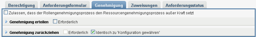 Aktivieren Sie dieses Kontrollkästchen, wenn bei der Anforderung der Ressource eine Genehmigung erforderlich ist. Deaktivieren Sie dieses Kontrollkästchen, wenn bei der Anforderung der Ressource keine Genehmigung erforderlich ist. |