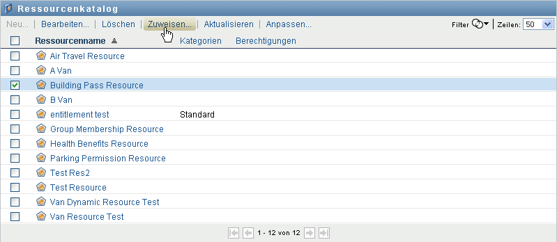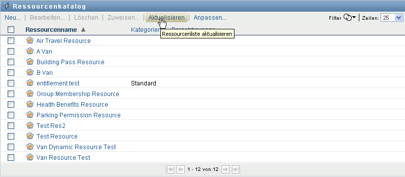 In der Benutzeranwendung wird eine Liste der derzeit im Katalog definierten Ressourcen angezeigt.