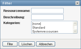 Geben Sie im Dialogfeld eine Filterzeichenkette für den Namen oder die Beschreibung der Ressource an oder wählen Sie eine oder mehrere Kategorien aus, für die Ressourcen angezeigt werden sollen. Klicken Sie auf :