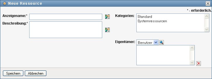 In der Benutzeranwendung wird das Dialogfeld „Neue Ressource“ angezeigt: