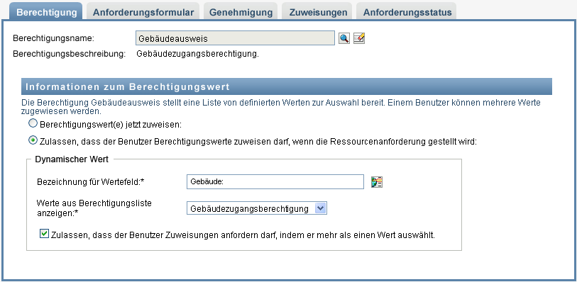 Die Berechtigung, die einen oder mehrere Parameterwerte akzeptiert. Beispielsweise ist eine Ressource an die Berechtigung „Gebäudeausweis“ gebunden, die dem Anforderer ermöglicht, ein oder mehrere Gebäude auszuwählen. Die zulässigen Werte werden von einer Berechtigungsliste geliefert, die eine statische Liste von Werten, die von einem Administrator definiert wurde, oder eine dynamische Liste von Werten, die aus einer LDAP-Abfrage generiert wurde, enthalten kann. Sie können zum Design-Zeitpunkt einen Wert zuweisen, wenn Sie die Ressource definieren, oder dem Benutzer ermöglichen, zum Anforderungszeitpunkt einen Wert zuzuweisen. Weitere Informationen finden Sie in Bindung an eine Berechtigung mit mehreren Werten. |