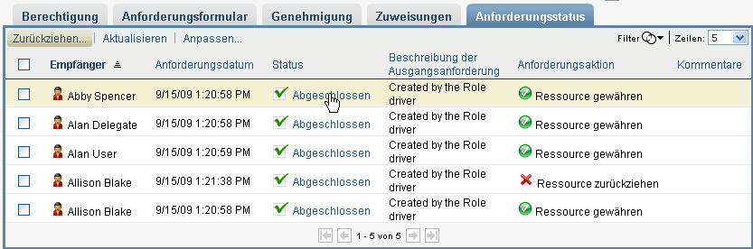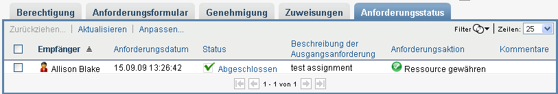 Die Aktion zeigt alle Ressourcenzuweisungsanforderungen an, einschließlich derer, die laufen, auf Genehmigung warten bzw. genehmigt, abgeschlossen, verweigert oder abgebrochen wurden.
