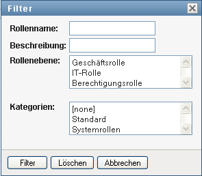 Geben Sie im Dialogfeld eine Filterzeichenkette für den Namen oder die Beschreibung der Rolle an oder wählen Sie eine oder mehrere Rollenebenen oder -kategorien aus.