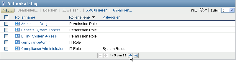 Sie können in der Rollenliste zu einer anderen Seite blättern, indem Sie im unteren Bereich der Liste auf die Schaltfläche „Weiter“, „Zurück“, „Erste“ oder „Letzte“ klicken: