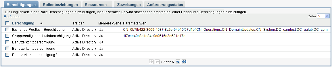 Mit vorhandenen Rollen verknüpfte Berechtigungen. Rollen, die in früheren Versionen des rollenbasierten Bereitstellungsmoduls definiert wurden, haben möglicherweise verknüpfte Berechtigungen. Wenn eine Rolle über eine verknüpfte Berechtigung verfügt, wird in der Benutzeroberfläche die Registerkarte angezeigt, auf der die Berechtigungszuordnungen aufgelistet sind und optional entfernt werden können. Berechtigungszuordnungen für Rollen können zwar in dieser Version weiter verwendet werden, aber Novell empfiehlt, dass Sie Berechtigungen mit Ressourcen verknüpfen und nicht mit Rollen.