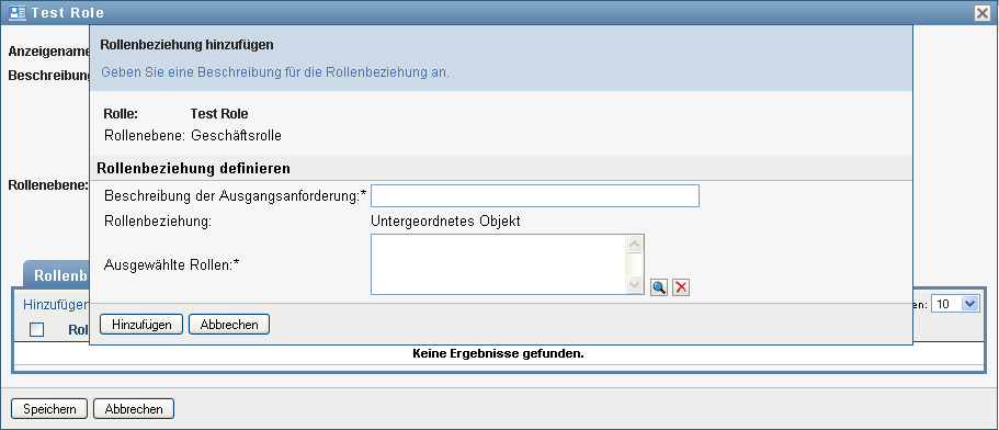 Rollen der untersten Ebene (Berechtigungsrollen) können in Rollen höherer Ebene enthalten sein, aber keine weiteren Rollen der untersten Ebene enthalten. Auf der Seite „Rollenbeziehungen“ können Sie nur eine Rolle höherer Ebene hinzufügen.