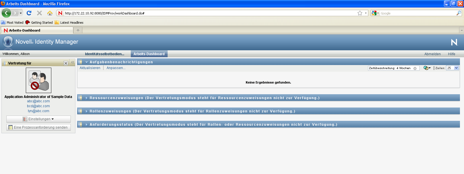 Die Benutzeranwendung aktualisiert die Anzeige und kehrt zur Aktion zurück. Diese Aktion wird nach der Anmeldung standardmäßig angezeigt. Die Aufgabenliste enthält Aufgaben, die dem Benutzer zugewiesen wurden, für den Sie als Vertretung agieren. Oberhalb der Gruppe (und in der Titelleiste) wird die Meldung angezeigt, dass Sie nun einen anderen Benutzer vertreten.