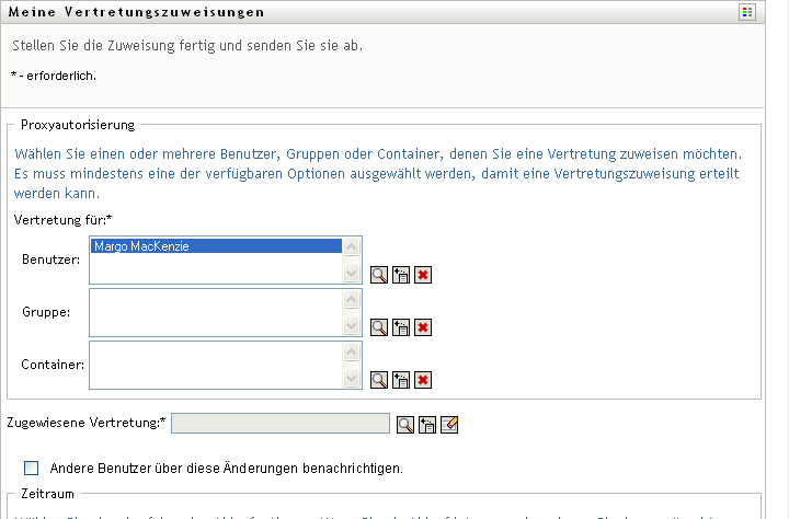 Wenn Sie ein Bereitstellungsadministrator sind, wählen Sie einen oder mehrere Benutzer, Gruppen oder Container aus, denen Sie eine Vertretung zuweisen möchten.