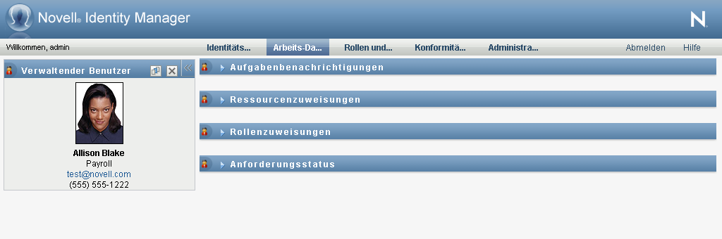Wenn Sie einen Benutzer, eine Gruppe, einen Container, eine Rolle oder ein Team auswählen, aktiviert das Arbeits-Dashboard den Verwaltungsmodus und aktualisiert den Abschnitt „Benutzerprofil“ im linken Bildschirmbereich. Die Anzeige des Benutzerprofils wird wie folgt aktualisiert: