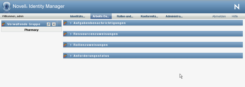 Das Arbeits-Dashboard zeigt das Fenster „Verwalten“ an:
