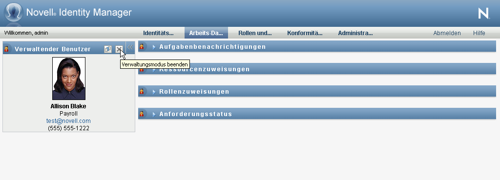So verlassen Sie den Verwaltungsmodus und setzen das Arbeits-Dashboard zurück, sodass die Daten und Zugriffsberechtigungen für den aktuell angemeldeten Benutzer angezeigt werden: