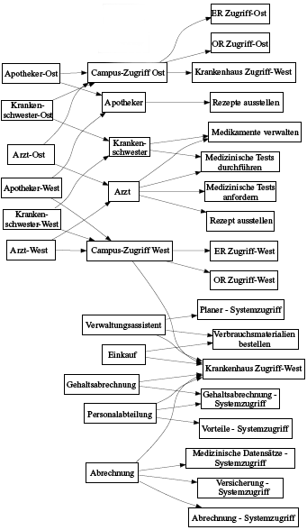 Die Funktionshierarchie unterstützt drei Ebenen. Funktionen, die auf höchster Ebene definiert wurden (Geschäftsfunktionen), definieren Operationen, die innerhalb der Organisation von geschäftlicher Bedeutung sind. Funktionen auf mittlerer Ebene (IT-Funktionen) unterstützen Technologiefunktionen. Funktionen, die auf der untersten Ebene der Hierarchie definiert wurden (Berechtigungsfunktionen), definieren Rechte auf niedriger Ebene. Das folgende Beispiel zeigt eine Funktionshierarchie mit drei Ebenen für eine medizinische Organisation. Die höchste Ebene der Hierarchie ist auf der linken und die niedrigste auf der rechten Seite dargestellt: