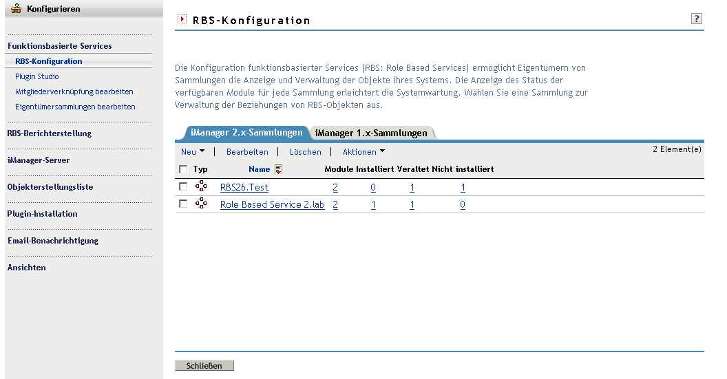 iManager 2.x-Sammlung: Zeigt die aktuellen RBS-Sammlungen an.