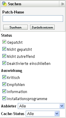 Der Abschnitt der Seite „Patches“ bietet umfassende Such- und Filteroptionen, mit denen Sie nach bestimmten Patches suchen und die Suchergebnisse auf Grundlage von „Status“ und „Auswirkung“ der Patches filtern können. Das Suchen und Filtern kann unabhängig voneinander oder auch kombiniert durchgeführt werden, um umfangreiche Drilldown-Möglichkeiten bereitzustellen. Die folgende Abbildung zeigt den Abschnitt :