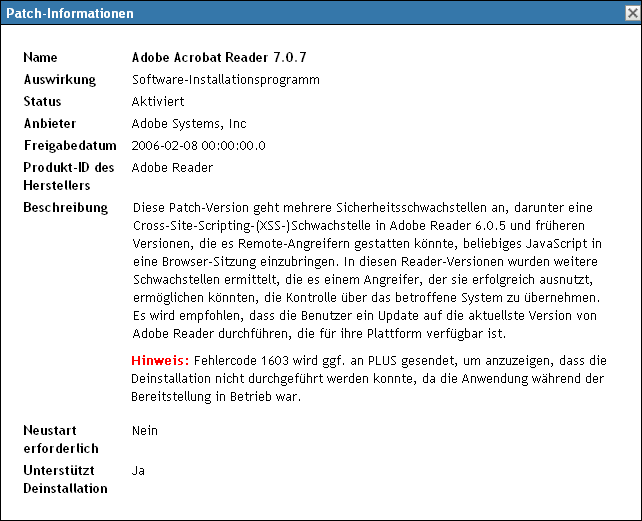 Die Auswirkung des Patches entsprechend der Festlegung durch Novell. Weitere Informationen hierzu finden Sie unter Abschnitt 7.2.4, Patch-Auswirkungen. |