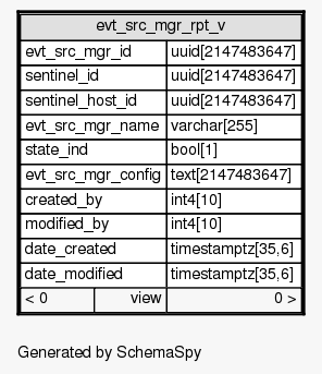 | View SIEM.public.evt_src_mgr_rpt_v The configuration information for all collector manager nodes (event source manager is an internal name used for collector manager nodes).