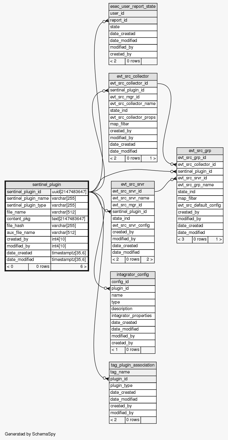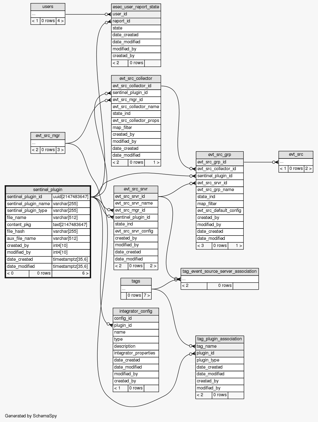 | Table SIEM.public.sentinel_plugin Details of plug-ins (such as collector, connector, and reports) imported into the system. This table references the plug-in zip files, which are located on the Sentinel server filesystem.