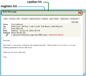 The base file is webacc.htt, which includes caption.htt and maindoc.htt. The maindoc.htt includes the features.htt and workspace.htt. Note that the interface for features.htt is showing that you are in the message view reading messages. The workspace.htt file contains folders.htt and msglist.htt. It is also used to toggle between other features, such as Document Management.