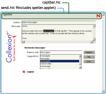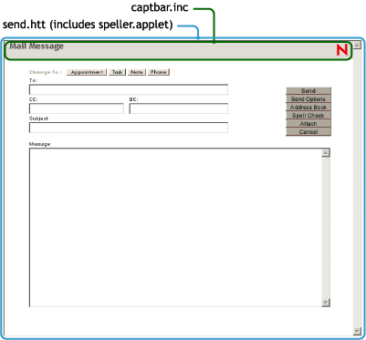 When the paper and pencil icon is selected, a separate window appears with the contents of send.htt. The send.htt file contains the speller.applet when Java-enhance mode is turned on. The spell check allows you to spell check the message you are composing to send. The send.htt file also contains the captbar.inc file that you can modify to change the logo on this screen and any other like screens that pop up when selected.