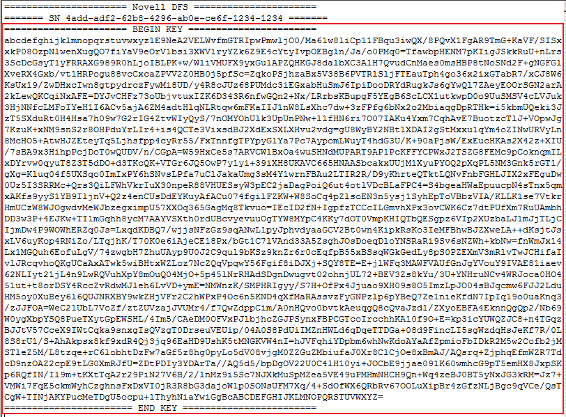 The file contains the serial number (the GUID in the file name) and the complete key code. The complete key code includes the series of equal signs that precede the label to the end of the series of equal signs that follow the label.