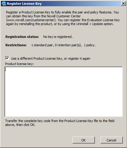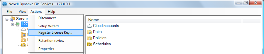You can enter a License Key at any time after you install Dynamic File Services. After a successful key registration, all features of the product are immediately available. You do not need to reinstall the product. The policy and pair created during evaluation remain in effect, as do any configuration settings you have made to the Service.