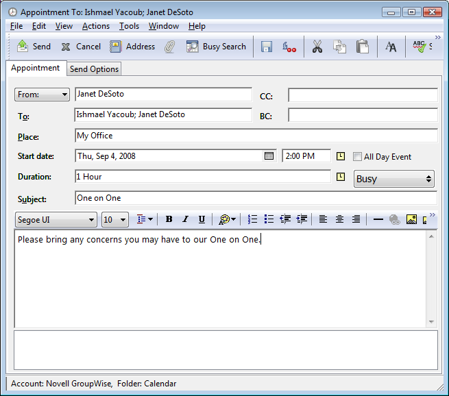 9. If you want to make sure the people and resources for the appointment are available, do a busy search by clicking Busy Search on the toolbar. For more information, see Using Busy Search to Check Availability.
