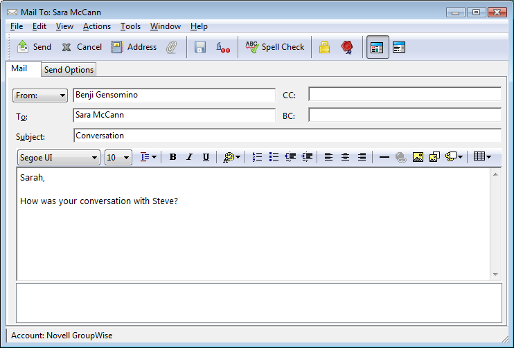 When you compose a message in GroupWise, you have a choice of using GroupWise, OpenOffice.org, or Microsoft Word as your editor to compose the message. If you choose to use OpenOffice.org or Word as your editor, the application’s functionality and formatting are available within the GroupWise compose window.