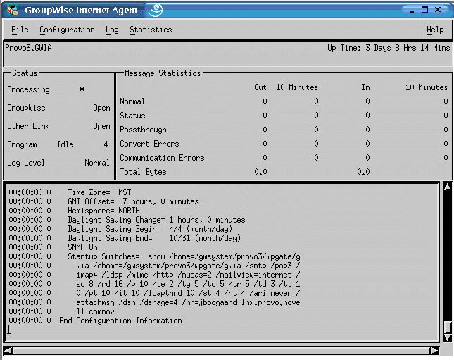 The status messages displayed on the Internet Agent console are also written to the Internet Agent log file (mmddlog.nnn) in the /var/log/novell/groupwise/domain.gwia directory. The log file name includes the month and day when it was created, along with an incrementing extension to accommodate multiple log files on the same day.