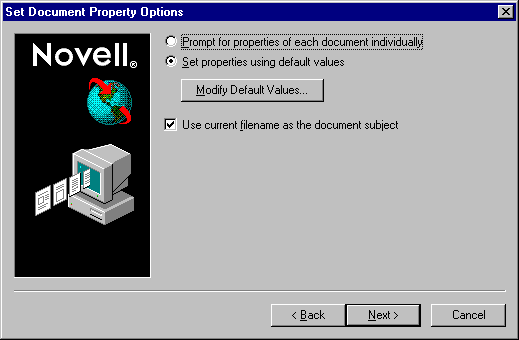 To have GroupWise specify properties based on the default property values specified in Document options, click Set Properties Using Default Values.