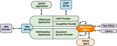 The WebAccess Agent receives user requests from the WebAccess Application and WebPublisher Application, accesses post offices and libraries to process the requests, and then passes information back to the applications.