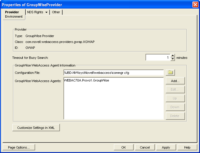 Customize Settings in XML: Click this button to launch the XML editor. You can use the editor to add, modify, or delete GroupWise service provider settings.