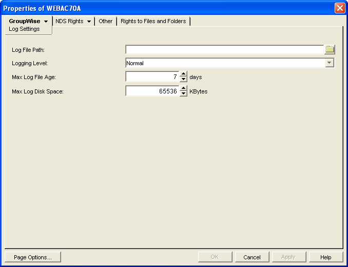 The following WebAccess applications (Web server servlets) create log files that are configured by editing the Log Settings property page of their objects in ConsoleOne:
