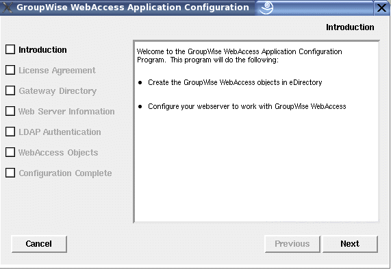 IMPORTANT:If you are installing GroupWise WebAccess on SUSE Linux Enterprise Server 10, refer to TID 3248145 in the Novell Support Knowledgebase for installation instructions.