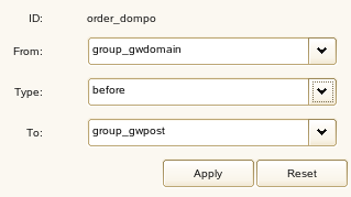 Specify the unique ID for the order constraint, select a node, select a type of order ( or ), select another node (Heartbeat Clustering Worksheet item 9 for a domain and item 10 for a post office), then click .