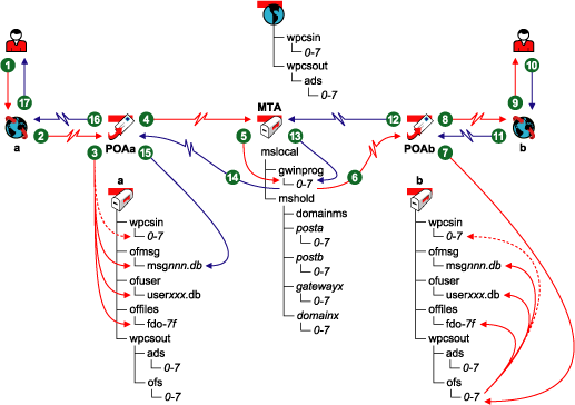 When the POA receives the new message from the MTA, it places it into the MTA output queue in the post office (wpcsout\ofs\0-7) on behalf of the MTA. Then, the POA for the recipient’s post office performs the following actions: