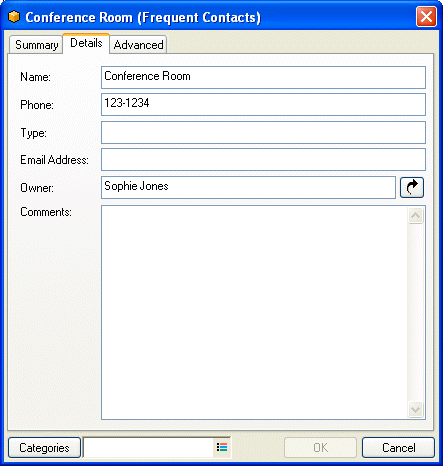 Use this tab to enter a name for the resource, a phone number, resource type, e-mail address, owner, and comments about this resource. In the Owner field, you can enter a contact that is already in your address book, or you can use the arrow button to create a new contact entry. |