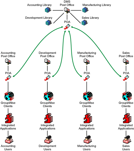 In the illustration, notice that all libraries belong to the DMS post office, which has no users. All GroupWise client users are using client/server access mode, which is required because there are no libraries in their local post offices. Each user has access to all four libraries through TCP/IP links to the DMS POA.