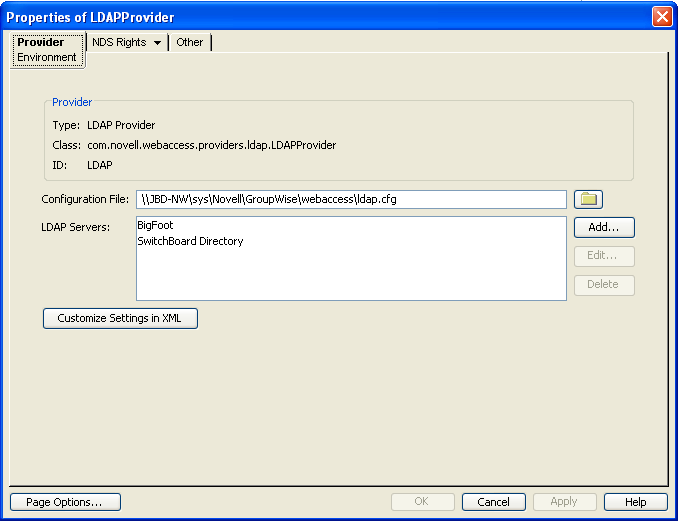 The GroupWise WebAccess installation program creates a Novell eDirectory object for the LDAP service provider in the same context as the WebAccess Application. The object is named LDAPProvider. Using ConsoleOne, you can modify the LDAPProvider object to define the LDAP services that the service provider can contact.