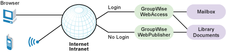 As shown above, GroupWise WebAccess requires users to have a mailbox in a GroupWise post office. GroupWise WebPublisher, on the other hand, is designed to provide public access to GroupWise library documents; WebPublisher users do not require a mailbox.