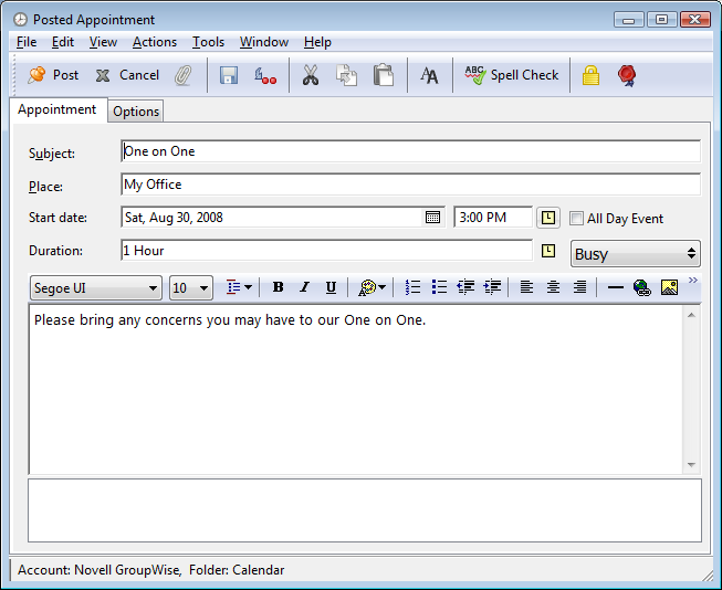 Posted appointments are placed in your Calendar on the date you specify. They are not placed in your Mailbox or in any other user’s Mailbox. Similarly, all posted appointments are saved to your main GroupWise calendar. To move them to a personal calendar, drag and drop them to the personal calendar after they are created.