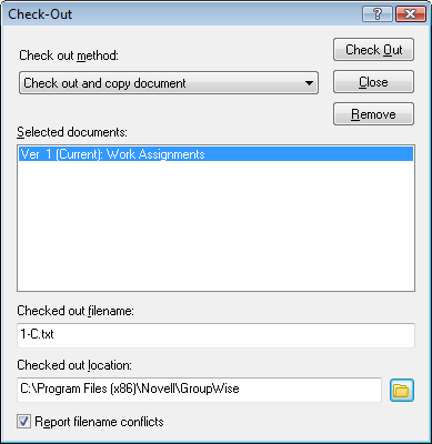 By default, GroupWise inserts the document number as the check-out filename. If you don’t specify a different filename, make a note of the numbered filename so you can locate your checked-out document.