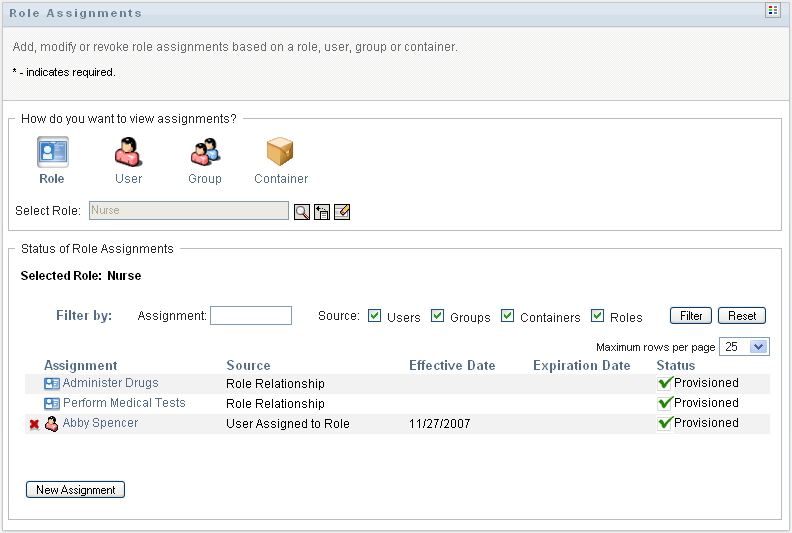 To view only those assignments that were assigned indirectly, select the box. Indirect assignments are those assignments that a user receives through a role relationship, or by being a member in a group or container.
