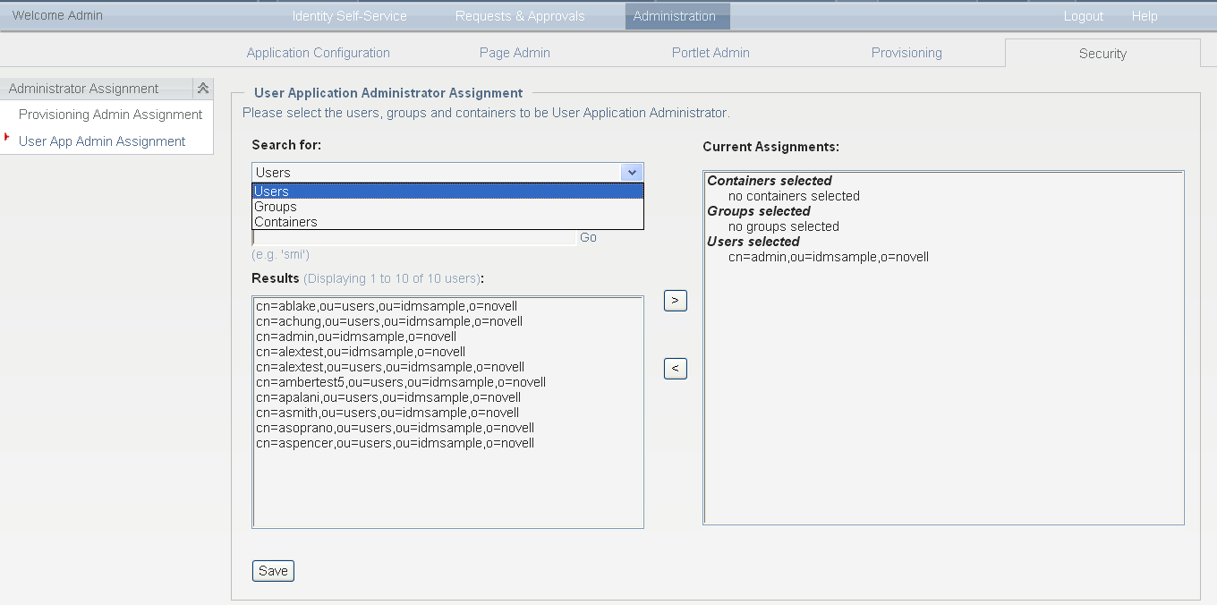 Select the users, group, or container you want to assign as User Application Administrators, then click (>).