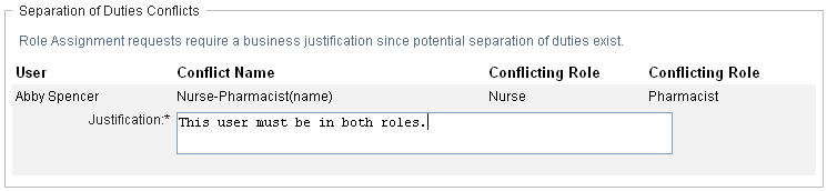 If a separation of duties conflict will occur if a role is assigned to the currently selected user, the user interface displays the box at the bottom of the page. In this case, you need to provide a business justification for the role assignment.