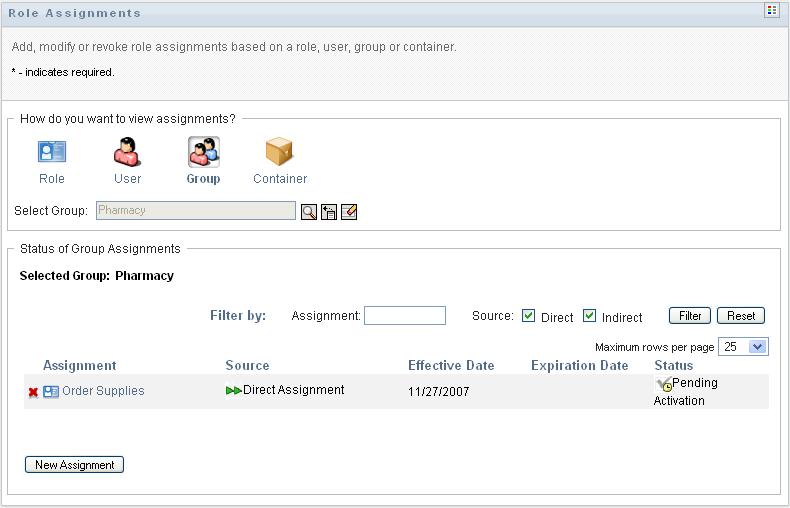 To view only those assignments that were assigned indirectly, select the box. Indirect assignments are those assignments that a group receives through a role relationship.